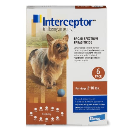 Dogs weighing 2 8 lbs should be given one interceptor plus chewable tablet orange box monthly.