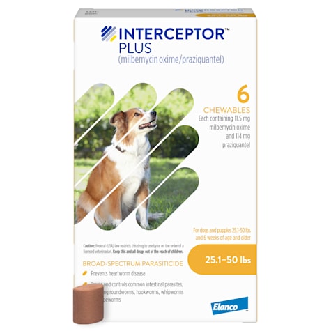 Interceptor plus milbemycin oxime praziquantel is a monthly chicken flavored chewable that prevents heartworm disease and treats and controls adult hookworm roundworm whipworm and tapeworm infections in dogs and puppies 6 weeks of age and older and 2 pounds of body weight or greater.