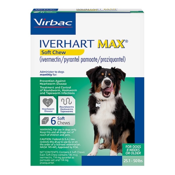 Iverhart max soft chew ivermectin pyrantel pamoate praziquantel is the only ivermectin based bacon flavored soft chew indicated for the prevention of heartworm disease caused by dirofilaria immitis and for the treatment and control of roundworms toxocara canis toxascaris leonina hookworms ancylostoma caninum uncinaria stenocephala ancylostoma braziliense and tapeworms.
