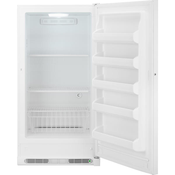 White upright freezer this freezer comes with fixed wire shelves and full width door bins giving you enough space to store over 400 lbs.