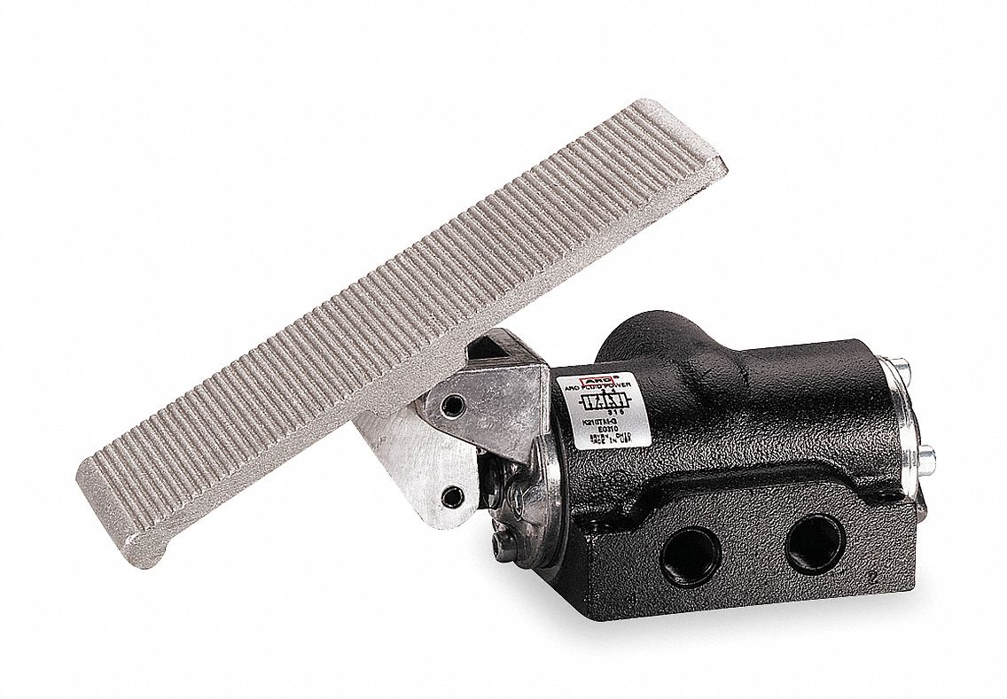 Manual air control valve 4 way 2 position pipe size 3 8 in actuator return foot pedal spring coefficient of volume 2 3 83 cfm temp.